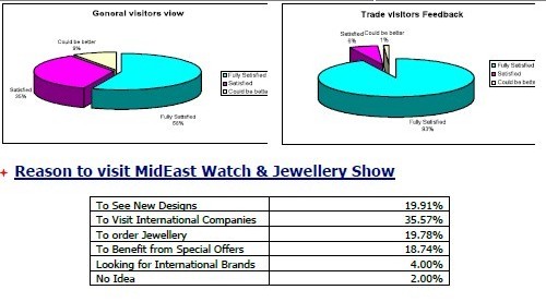 中东沙迦珠宝钟表展汇集了来自世界各地的贸易商、零售商、设计师及行业相关的领军人物,最大限度的展示了时尚珠宝钟表的创作。中东沙迦钟表珠宝展为全球贸易商提供了一个独特的专业的平台,它是全球专业的珠宝钟表类的展会之一。它吸引了来自亚美尼亚,巴林,巴西,中国,印度,意大利,日本,约旦,黎巴嫩,立陶宛,马来西亚,缅甸,卡塔尔,沙特阿拉伯,新加坡,泰国,土耳其,美国等25个国家的超过500多家参展商,展出面积超过20000平方米,到会观展商来自35个国家,人数高达54989人,观展商以贸易商为主。透过对参展商了解到,95%的展商将继续参展第35届展会。